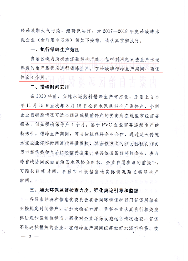 執(zhí)行錯峰生產(chǎn)的范圍包括自治區(qū)境內(nèi)所有水泥熟料生產(chǎn)線,包括利用電石渣生產(chǎn)水泥的熟料線,在采暖季確保停窯四個月。時間安排為2017年11月15日至2018年3月15日全部水泥熟料生產(chǎn)線停產(chǎn)。有特殊情況的企業(yè)可延遲或提前停產(chǎn),但必須確保停夠四個月。原文如下: