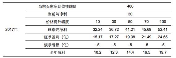 顯而易見,考慮到水泥的區(qū)域性,京津冀的水泥企業(yè)最為受益雄安新區(qū)的建設(shè),主要標(biāo)的是冀東水泥和金隅股份,此外山西、遼寧、內(nèi)蒙也會(huì)受益。我們先對(duì)冀東水泥的盈利做彈性測(cè)算:1、考慮到淡旺季盈利水平的差異較大,我們做了淡季和旺季經(jīng)營(yíng)的一個(gè)拆分。其中11/12/1/2/3 定義為淡季;就 2016 年看,旺季估算盈利 7 億左右,淡季虧損 9 億左右(經(jīng)營(yíng)性利潤(rùn)表現(xiàn))。2、京津冀水泥價(jià)格 4 月初提漲 50 元,對(duì)應(yīng)的石家莊到位掛牌價(jià)在 400 元左右,類比去年 Q4,此價(jià)格下公司旺季的噸凈利在 30 元左右;3、我們?cè)谀壳?400 元的到位掛牌價(jià)基礎(chǔ)上做了測(cè)算,假設(shè)提價(jià) 10-100 元五個(gè)區(qū)間進(jìn)行測(cè)算,結(jié)果顯示,均價(jià)提升 30 元,公司有望實(shí)現(xiàn)旺季盈利 17 億元以上,考慮到淡季一定虧損,全年盈利有望在 12 億以上。4、按照此測(cè)算方法測(cè)算結(jié)果偏謹(jǐn)慎,實(shí)際盈利會(huì)比好于此,源于:第一,價(jià)格執(zhí)行到位的話, 400 元到位價(jià)對(duì)應(yīng)的噸凈利超過 30 元;第二,并沒有考慮外圍市場(chǎng)可能價(jià)格也會(huì)提升,尤其是山西和內(nèi)蒙等華北市場(chǎng);第三,沒有考慮需求量帶來的增長(zhǎng)。