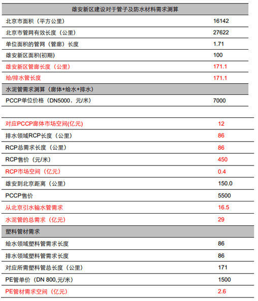 城市管廊:新城區(qū)建設(shè)必將帶動(dòng)管網(wǎng)建設(shè)加速,考慮到雄安建設(shè)基本屬于新城,且中期看綜合管廊建設(shè)必將成為趨勢(shì),我們假設(shè)城區(qū)建設(shè)的管線全部采取管廊方式建設(shè);所有的給排水管全部遷入管廊;主要拉動(dòng)的管子需求為 PCCP、 RCP、塑料管;我們測(cè)算假設(shè)前提如下:1、廊體:采取預(yù)制式, PCCP2、給水:塑料管+球磨鑄鐵,各占 50%;3、排水: RCP+塑料管,各占 50%;;4、遠(yuǎn)程輸水:從水庫(kù)到自來水廠, PCCP;測(cè)算結(jié)果:1、我們參考北京當(dāng)前的管線密度(單位面積對(duì)應(yīng)的管線長(zhǎng)度)估算雄安新區(qū)的管廊/管線長(zhǎng)度;2、長(zhǎng)距離輸水,我們假設(shè)從北京引水過來,距離 150 公里, 2 根 PCCP 管并行輸送;3、測(cè)算結(jié)果顯示,初期建設(shè) 100 平方公里的面積,對(duì)應(yīng)水泥管需求在 29 億元,塑料管 2.6 億元,假設(shè) 3 年建設(shè)完成,每年對(duì)應(yīng)的水泥管和塑料管需求在 10 和 0.9 億元。
