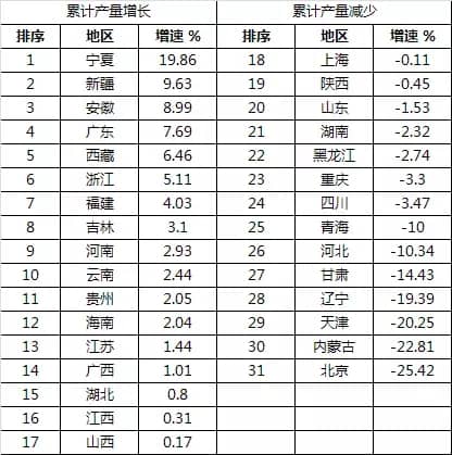 在各省市區(qū)水泥產(chǎn)量中,寧夏自治區(qū)水泥產(chǎn)量同比出現(xiàn)大幅提高,達19.86%,領先全國。而北京地區(qū)水泥產(chǎn)量同比下降最大,降幅達25.42%。