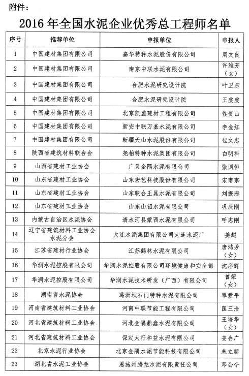 附件:2016年全國水泥企業(yè)優(yōu)秀總工程師名單