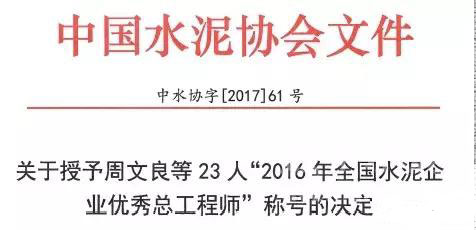 現(xiàn)決定授予周文良等23人“2016年全國水泥企業(yè)優(yōu)秀總工程師”稱號(hào)。希望全國水泥企業(yè)的生產(chǎn)和技術(shù)負(fù)責(zé)人向獲得表彰的優(yōu)秀總工學(xué)習(xí),在企業(yè)的技術(shù)進(jìn)步、技術(shù)創(chuàng)新和節(jié)能減排等方面做出更大貢獻(xiàn)。
