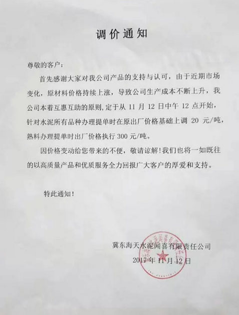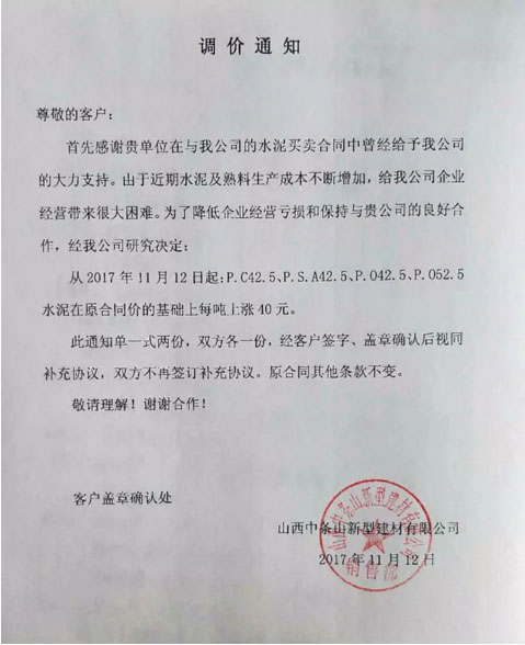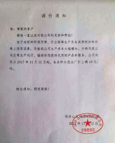 晉城山水水泥提價(jià)通知:近期,環(huán)保部、發(fā)改委、工信部等部委共同印發(fā)《京津冀及周邊地區(qū)2017-2018年秋冬季大氣污染綜合治理攻堅(jiān)行動方案》,方案指出今年采暖季(2017年11月15日-2018年3月15日)“2+26”城市水泥建材行業(yè)全部停產(chǎn),限產(chǎn)已成常態(tài),加之近期能源、電力及生產(chǎn)水泥的原燃料材料價(jià)格持續(xù)上漲,礦渣、礦粉大幅度提價(jià),這些因素都造成了我公司水泥生產(chǎn)成本大幅增加。經(jīng)公司決定自2017年11月13日9點(diǎn)對公司所有品種水泥出廠價(jià)格上調(diào)40元/噸。