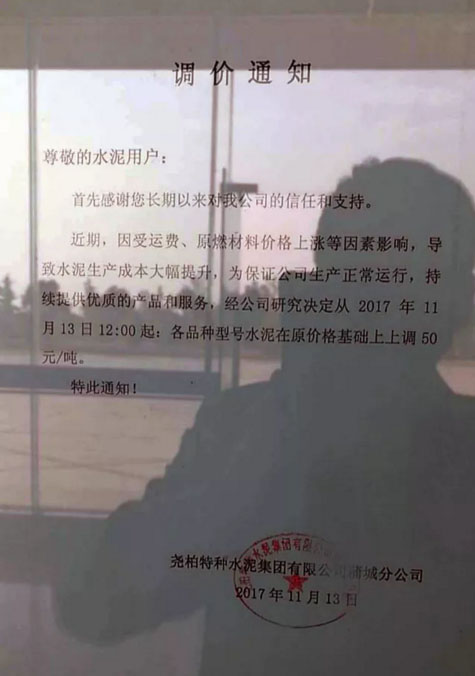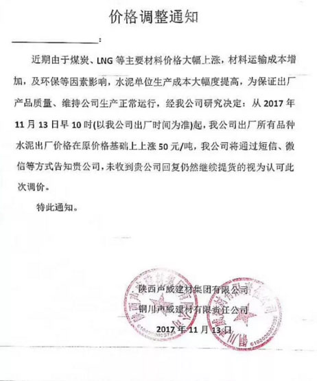陜西聲威建材集團(tuán)有限公司銅川聲威建材有限責(zé)任公司提價(jià)通知:由于近期煤炭、LNG等主要材料價(jià)格大幅上漲,材料運(yùn)輸成本增加及環(huán)保等因素影響,水泥單位生產(chǎn)成本大幅度提高,為保證出廠產(chǎn)品質(zhì)量,維持公司生產(chǎn)正常運(yùn)行,經(jīng)研究決定,從2017年11月13日早10點(diǎn)起所有品種水泥出廠價(jià)格在原價(jià)格基礎(chǔ)上上漲50元/噸。
