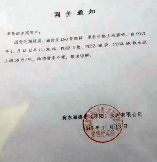 冀東海德堡(涇陽)水泥有限公司提價(jià)通知