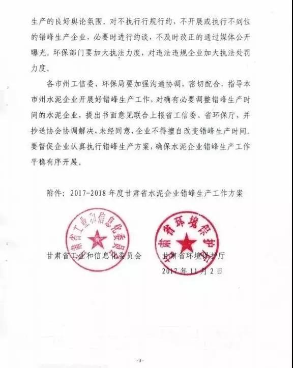 【水泥人網(wǎng)】近日,甘肅省工信委、環(huán)保廳聯(lián)合發(fā)布《關(guān)于做好2017-2018年度水泥錯峰生產(chǎn)工作的通知》(以下簡稱“通知”)。通知要求,自2017年11月1日起至2018年3月15日,各市州工信部門嚴(yán)格按照市州政府2017—2018年大氣污染冬防工作方案要求,督促企業(yè)認(rèn)真執(zhí)行相關(guān)法律法規(guī)和強(qiáng)制性標(biāo)準(zhǔn),強(qiáng)化對企業(yè)環(huán)保設(shè)施運(yùn)行情況檢查,加大技術(shù)改造力度,在錯峰生產(chǎn)期間統(tǒng)籌做好生產(chǎn)線技術(shù)改造,設(shè)備檢修等工作,著力改善生產(chǎn)環(huán)境,實現(xiàn)達(dá)標(biāo)排放。