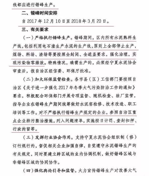 通知文件要求,錯峰生產(chǎn)期間,自治區(qū)內(nèi)所有水泥熟料生產(chǎn)線(包括利用電石渣生產(chǎn)水泥的生產(chǎn)線),原則上全部停止生產(chǎn),煤場、料場、渣場等要按照全封閉、全遮蓋要求,強(qiáng)化治理,實現(xiàn)污染物零排放。對不嚴(yán)格執(zhí)行錯峰生產(chǎn)規(guī)定的企業(yè),參照自治區(qū)重點(diǎn)企業(yè)排污整治措施,列入問題清單,實施按日計罰、查封扣押、行政拘留等。通知原文如下: