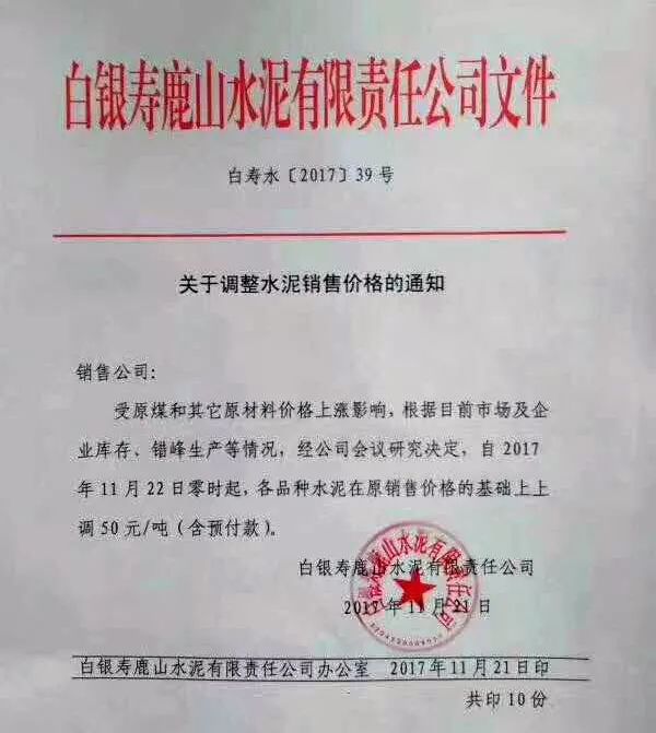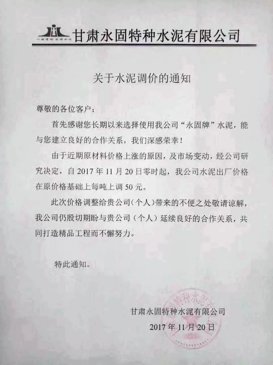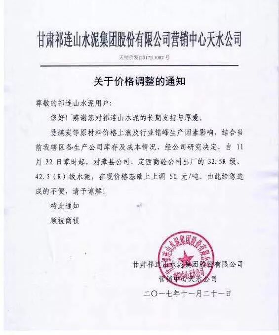 甘肅祁連山水泥集團股份有限公司營銷中心天水公司關于調(diào)整平天高速水泥價格的通知稱,由于受原燃材料價格大幅上漲和水泥企業(yè)錯峰生產(chǎn)的影響,公司已于2017年10月30日對天水區(qū)域市場各品種水泥出廠價格上調(diào)50元/噸。經(jīng)研究決定從2017年11月17日起,對平天高速各用戶各品種水泥出廠價格上調(diào)50元/噸。