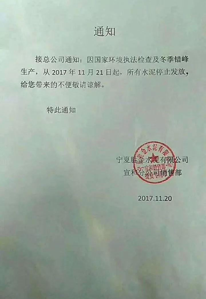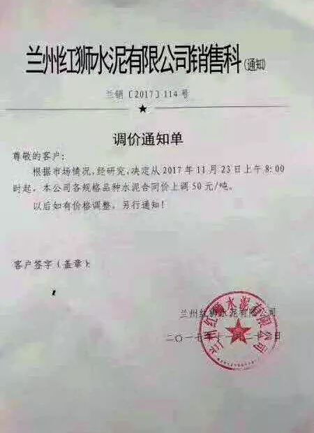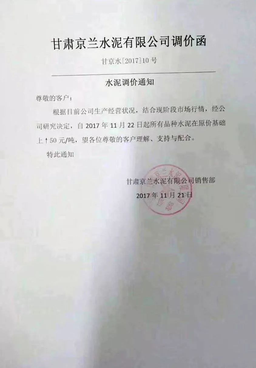 區(qū)域主導企業(yè)祁連山水泥價格調(diào)整通知稱:因受原材料價格上漲和水泥行業(yè)錯峰生產(chǎn)影響,考慮目前市場及庫存情況,經(jīng)公司研究決定,自2017年11月22日零時起對永登公司、蘭州商砼公司、永固公司各品種水泥出廠價在現(xiàn)有價格基礎上上調(diào)50元/噸。