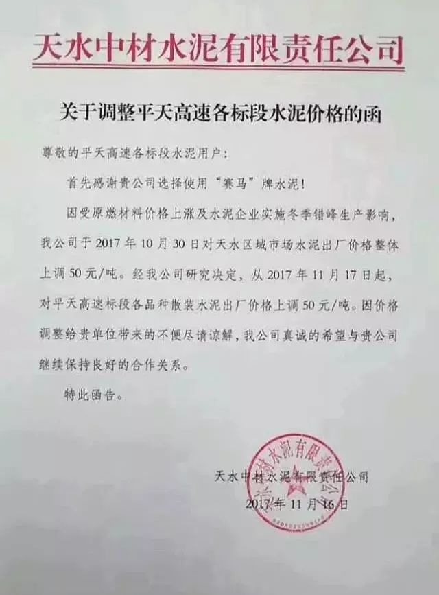 此前區(qū)域主導企業(yè)就曾針對重點工程做過價格調(diào)價。天水中材水泥有限責任公司關于調(diào)整平天高速各標段水泥價格的函:因受原燃材料價格上漲及水泥企業(yè)實施冬季錯峰生產(chǎn)影響,公司于2017年10月30日對天水區(qū)域市場水泥 出廠價格整體上調(diào)50元/噸。經(jīng)公司決定從11月17日起,對平天高速標段各品種散裝水泥出廠價格上調(diào)50元/噸。