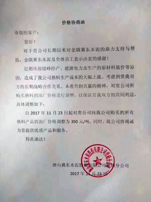 河北省主導(dǎo)企業(yè)唐山冀東水泥于昨日發(fā)布了熟料價(jià)格協(xié)商函,《價(jià)格協(xié)商函》稱(chēng)因近期環(huán)保錯(cuò)峰停產(chǎn)、能源電力及生產(chǎn)的原材料漲價(jià)等原因,造成了公司熟料生產(chǎn)成本的大幅上漲。考慮到長(zhǎng)期戰(zhàn)略合作關(guān)系,本著共贏的精神,自23日起熟料出廠價(jià)格上調(diào)為350元/噸 。