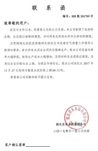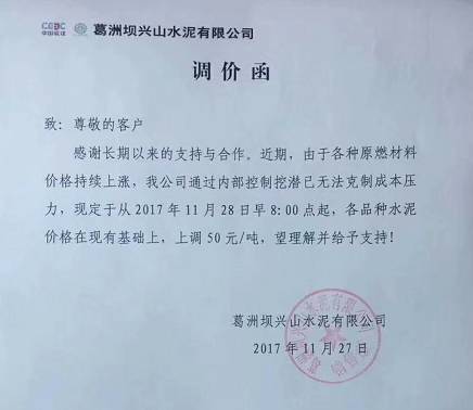 葛洲壩興山水泥有限公司《調(diào)價函》