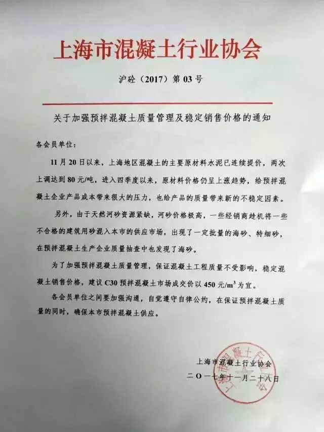 今年這一年水泥漲價(jià),混凝土行業(yè)也并不平靜。9月15日,無錫34家混凝土企業(yè)聯(lián)合發(fā)告用戶書,通知從2017年9月15日開始,普通C30混凝土保本價(jià)為400元每方,軌道、高架等重點(diǎn)項(xiàng)目的價(jià)格在此基礎(chǔ)上增加30元每方。