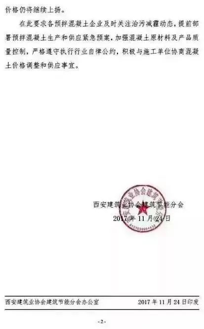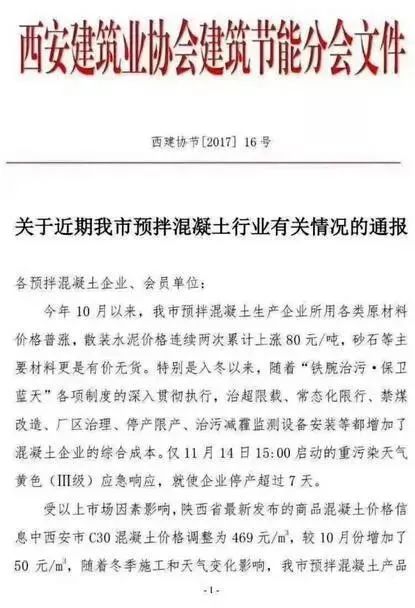 此前西安建筑業(yè)協(xié)會建筑節(jié)能分會曾發(fā)布關(guān)于近期西安預(yù)拌混凝土行業(yè)有關(guān)情況的通報(bào),通報(bào)稱,今年10月以來,西安市預(yù)拌混凝土生產(chǎn)企業(yè)所用各類原材料價(jià)格普漲,散裝水泥價(jià)格連續(xù)兩次累計(jì)上漲80元/噸,砂石等主要材料更是有價(jià)無貨。特別是入冬以來,隨著“鐵腕治污,保衛(wèi)藍(lán)天”各項(xiàng)制度的深入貫徹執(zhí)行,治超限載,常態(tài)化限行、禁煤改造,廠區(qū)治理,停產(chǎn)限產(chǎn)、治污減霾監(jiān)測設(shè)備安裝等都增加了混凝土企業(yè)的綜合成本。僅11月14日15:00啟動的重污染天氣黃色應(yīng)急響應(yīng),就使企業(yè)停產(chǎn)超過七天。