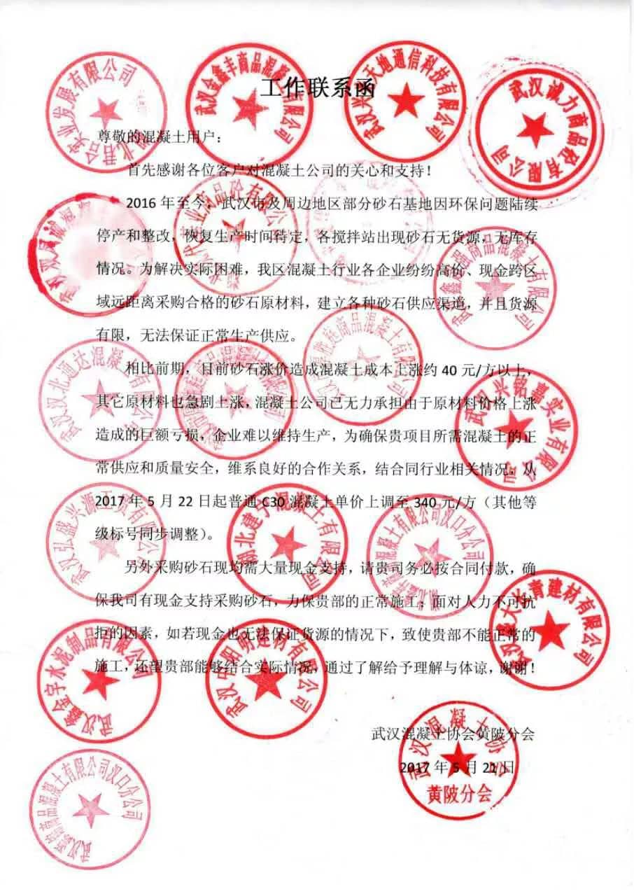 今年五月份的時候,武漢混凝土協(xié)會黃陂分會就曾發(fā)布工作聯(lián)系函,聯(lián)系函稱,2016年至今,武漢市及周邊地區(qū)部分砂石基地因環(huán)保問題陸續(xù)停產(chǎn)和整改,恢復(fù)生產(chǎn)時間待定,各攪拌站出現(xiàn)砂石無貨源,無庫存情況。為解決實(shí)際困難,區(qū)混凝土行業(yè)各企業(yè)紛紛高價(jià)、現(xiàn)金跨區(qū)域遠(yuǎn)距離采購合格的砂石原材料,建立各種砂石供應(yīng)渠道,并且貨源有限,無法保證正常生產(chǎn)供應(yīng)。