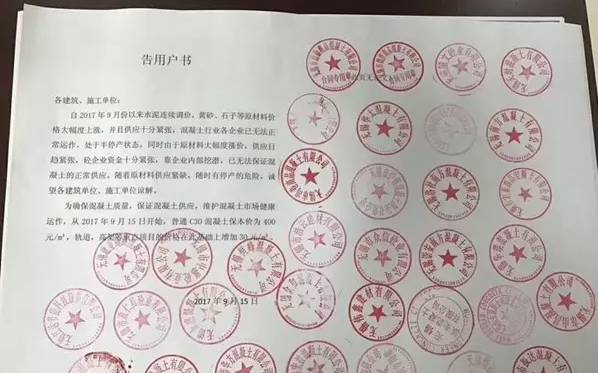 告用戶書表示,自2017年9月份以來,水泥連續(xù)系調(diào)價(jià),黃砂、石子等原材料價(jià)格大幅度上漲,并且供應(yīng)十分緊張,混凝土行業(yè)各企業(yè)已無法正常運(yùn)作,處于半停產(chǎn)狀態(tài),同時由于原材料大幅度漲價(jià),供應(yīng)日趨緊張,混凝土企業(yè)資金十分緊張,靠企業(yè)內(nèi)部挖潛,已無法保證混凝土的正常供應(yīng)。隨著原材料供應(yīng)緊缺,隨時有停產(chǎn)的危險(xiǎn),希望各建筑、施工單位諒解。