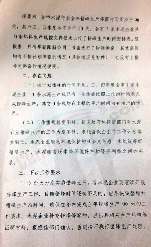 下步工作要求指出:加大力度實(shí)施錯(cuò)峰生產(chǎn)。各水泥企業(yè)要繼續(xù)開(kāi)展錯(cuò)峰生產(chǎn)工作,目前錯(cuò)鋒時(shí)間還有不足的,應(yīng)盡快調(diào)整增加錯(cuò)峰生產(chǎn)的時(shí)間,確保在年內(nèi)完成全年錯(cuò)峰生產(chǎn)90天的工作要求。水泥企業(yè)補(bǔ)充錯(cuò)峰停窯的,應(yīng)出具相關(guān)生產(chǎn)用電等證明材料,報(bào)經(jīng)信部門(mén)確認(rèn),否則按不執(zhí)行錯(cuò)峰生產(chǎn)處理。