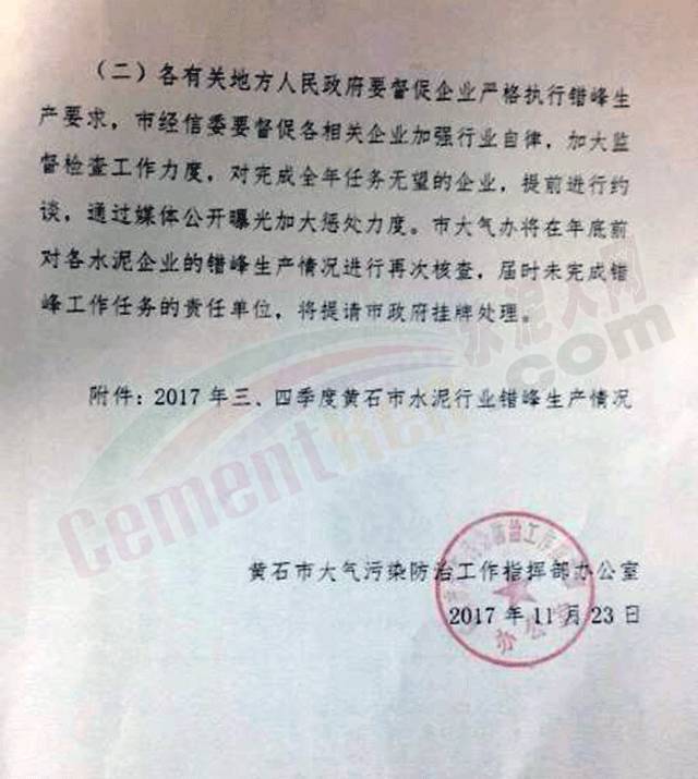 【水泥人網(wǎng)】日前,黃石市大氣污染防治工作指揮部辦公室發(fā)布黃石市大氣污染防治工作指揮部辦公室關(guān)于黃石市2017年三四季度水泥行業(yè)錯(cuò)峰生產(chǎn)執(zhí)行情況的通報(bào)。通報(bào)稱(chēng),按要求,全市水泥行業(yè)全年錯(cuò)峰生產(chǎn)停窯時(shí)間不少于90天,其中三、四季度各不少于20天,全市7家水泥企業(yè)共10條熟料生產(chǎn)線(xiàn)按文件要求上報(bào)了錯(cuò)峰生產(chǎn)時(shí)間安排表。經(jīng)核查,只有華新陽(yáng)新公司1號(hào)窯進(jìn)行了錯(cuò)峰停窯,其他窯線(xiàn)均有不按計(jì)劃停窯的情況,也沒(méi)有上報(bào)補(bǔ)充停窯的情況說(shuō)明。