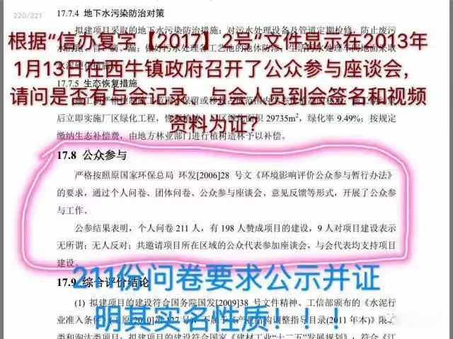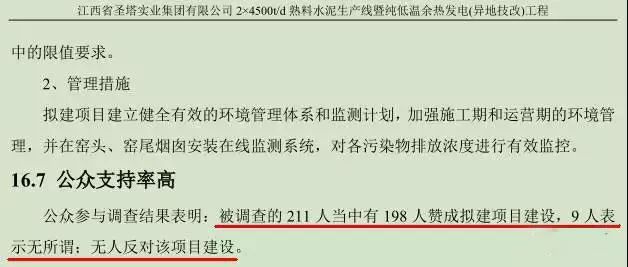 衛(wèi)生防護(hù)距離包絡(luò)圖未按國家標(biāo)準(zhǔn)的以污染源為中心點(diǎn),以防護(hù)距離為半徑作圓形輻射包絡(luò)。而是畫成了矩形圖案,”巧妙”的規(guī)避了本應(yīng)在防護(hù)距離范圍內(nèi)的一些敏感點(diǎn)民宅。環(huán)評(píng)報(bào)告書中的公眾參與人數(shù)前后不一致:2013年4月江西省圣塔實(shí)業(yè)集團(tuán)有限公司2x4500t/d熟料生產(chǎn)線暨純低溫余熱發(fā)電(異地技改)工程環(huán)境影響評(píng)價(jià)報(bào)告書中的”15.3公眾參與調(diào)查結(jié)果統(tǒng)計(jì)與分析一文的第(2)條寫出發(fā)放調(diào)查問卷211份,收回問卷211份,回收率100%”。可是在接下來的16.7公眾支持率高里卻出現(xiàn)了”被調(diào)查的211人當(dāng)中有198人贊成擬建項(xiàng)目建設(shè),9人表示無所謂,無人反對(duì)該項(xiàng)目建設(shè)”,可是198+9=207人,剩下4人不見其蹤;