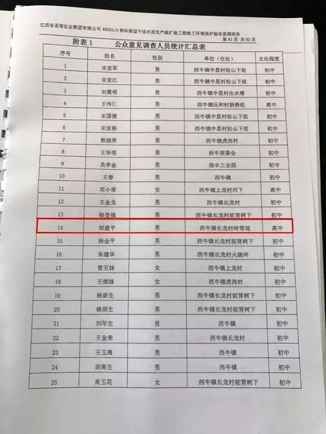 公參人員不真實(shí),當(dāng)?shù)卦S多村民未接到任何電話核實(shí)和調(diào)查表。比如鄒先生的小兒子鄒建平,當(dāng)時(shí)他并未在信豐工作,也并未收到任何電話或書面的調(diào)查與意見詢問,可在企業(yè)的環(huán)評(píng)報(bào)告書中的公參人員意見表中卻赫然寫著鄒建平的名字;