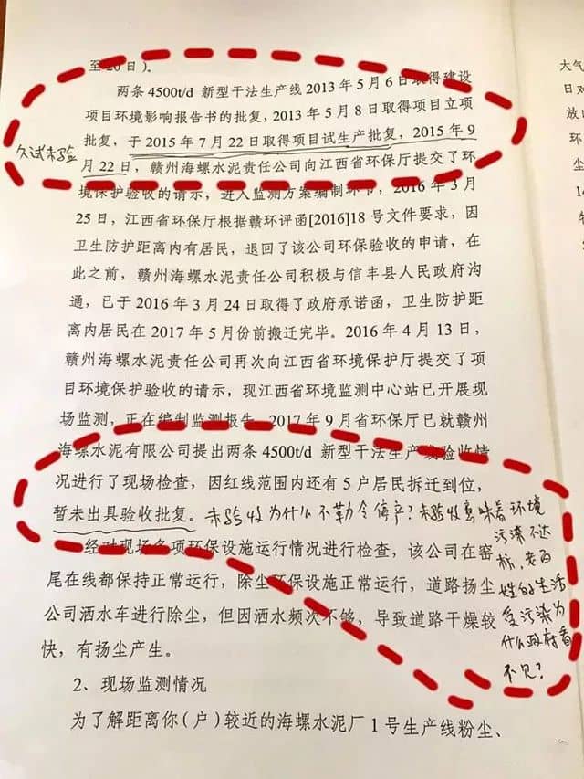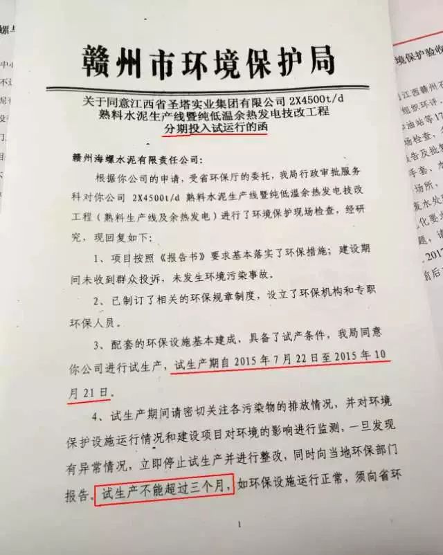 在海螺水泥未依法取得環(huán)評(píng)驗(yàn)收前,默許其違規(guī)生產(chǎn)達(dá)2年之久(贛州市環(huán)保局2015年7月22日發(fā)的試運(yùn)行函:試生產(chǎn)期自2015年7月22日至2015年10月21日,試生產(chǎn)期不能超過三個(gè)月),縱容企業(yè)”久試未驗(yàn)”的事實(shí)。麻痹對(duì)待對(duì)信訪群眾,相關(guān)資料不依法公示(村民依法寫了申請(qǐng)公示不給查看)、投訴信訪回復(fù)的數(shù)據(jù)和文字漏洞百出;