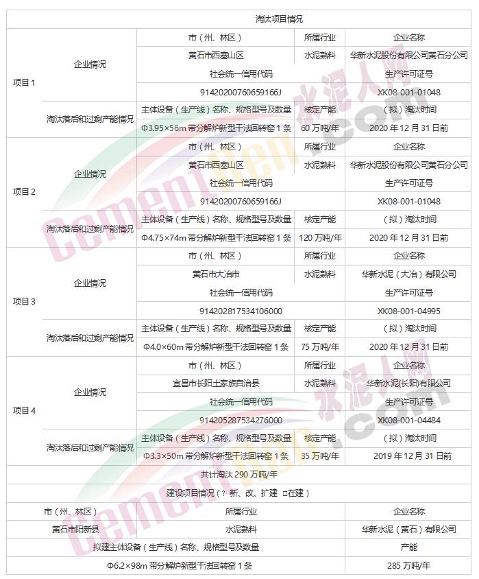 【水泥人網(wǎng)】日前湖北省經(jīng)信委發(fā)布《關(guān)于華新水泥股份公司年產(chǎn)285萬噸水泥熟料生產(chǎn)線項目產(chǎn)能置換方案的公告》。