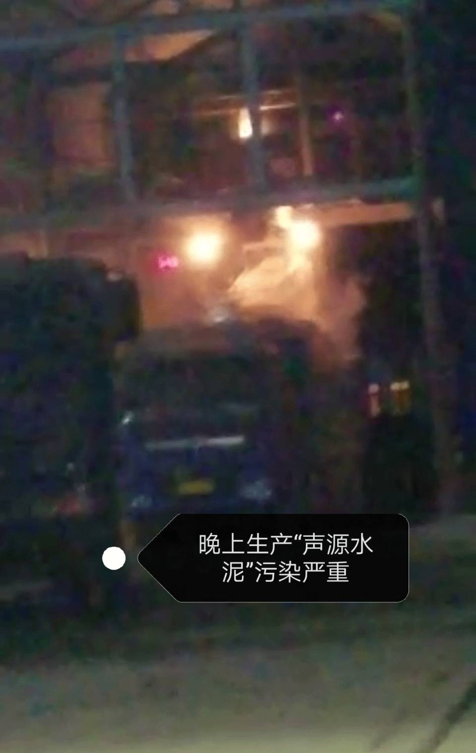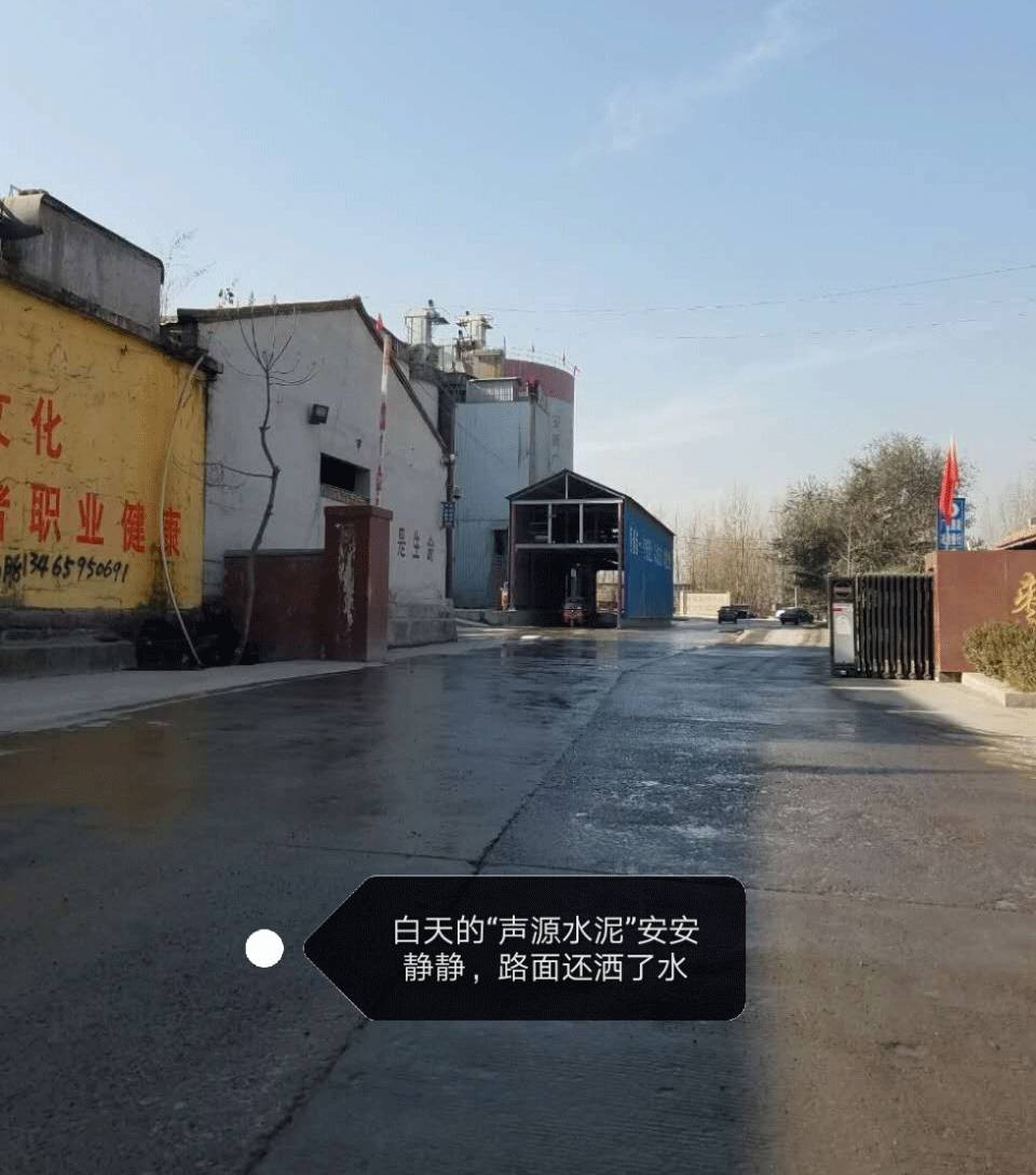 同樣也是在夜幕降臨后棗莊聲源水泥的設(shè)備也啟動(dòng)起來(lái)。就在大門(mén)口的設(shè)備生產(chǎn)的水泥通過(guò)出料口被拉散裝水泥的車(chē)直接拉走,廠區(qū)上空粉塵朦朧。白天確是一片安靜設(shè)備停著沒(méi)有聲音,地面也經(jīng)過(guò)灑水處理。