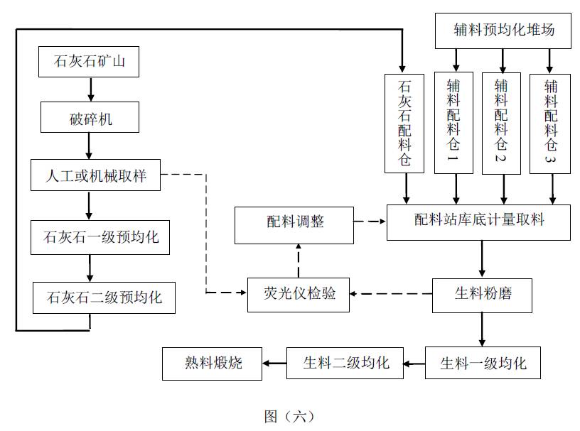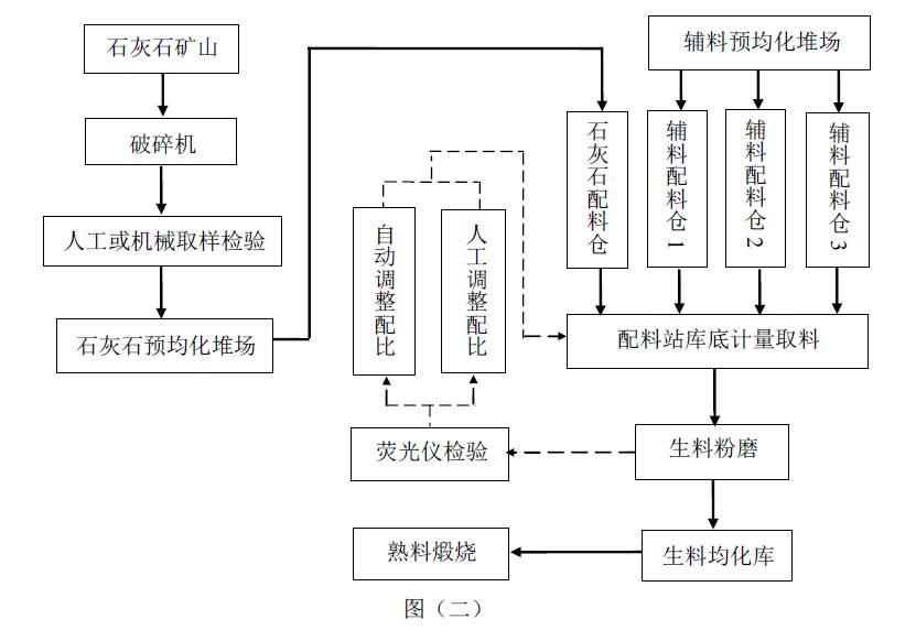 “圖二”是目前比較通用的水泥生料質(zhì)量控制圖,礦山石灰石進(jìn)廠經(jīng)破碎后,通過人工或機(jī)械取樣檢驗(yàn),進(jìn)入石灰石預(yù)均化堆場(chǎng),經(jīng)取料機(jī)取料后進(jìn)入石灰石配料倉(cāng),配料站庫(kù)底計(jì)量取料后進(jìn)行生料粉磨,出磨生料經(jīng)過連續(xù)取樣、熒光儀檢驗(yàn)后進(jìn)入生料均化庫(kù),最后進(jìn)行熟料煅燒,原料配比調(diào)整有自動(dòng)調(diào)整和人工調(diào)整兩種方式。