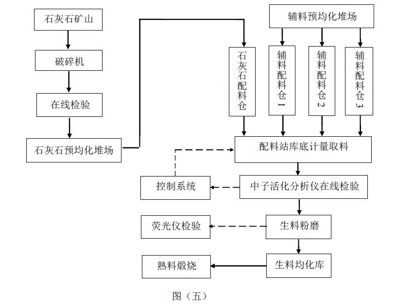 “圖五”是目前比較先進(jìn)的水泥生料質(zhì)量控制圖,在好多大企業(yè)得到應(yīng)用,進(jìn)廠石灰石經(jīng)破碎后在傳送帶上用中子活化分析儀進(jìn)行在線檢驗(yàn),經(jīng)均化后進(jìn)入配料站。在配料站的庫(kù)底進(jìn)行計(jì)量取料,用中子活化分析儀對(duì)傳送帶上的所有入磨混合物料進(jìn)行在線檢驗(yàn),一分鐘提供一次檢驗(yàn)數(shù)據(jù),同時(shí)配備的控制系統(tǒng)一分鐘自動(dòng)調(diào)整一次原料配比,出磨生料同樣需要熒光儀檢驗(yàn),防止失控。