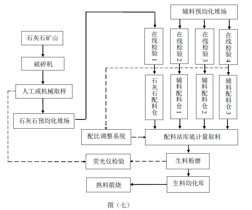 實(shí)現(xiàn)水泥生料前置控制,一直是有關(guān)專家和企業(yè)技術(shù)人員的夢(mèng)想,“圖七”是前置全檢型水泥生料質(zhì)量控制思路,將所有的入磨物料全部進(jìn)行在線檢驗(yàn),提前確定入磨物料的原料配比,這是多年前有關(guān)業(yè)內(nèi)人士提出的設(shè)想,屬于前置式的生料質(zhì)量控制,可走出事后調(diào)整的誤區(qū),控制思路是先進(jìn)的,但是有幾個(gè)問題應(yīng)該注意: