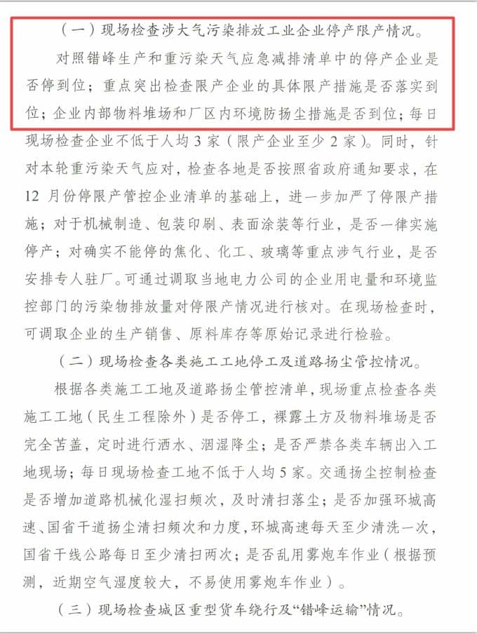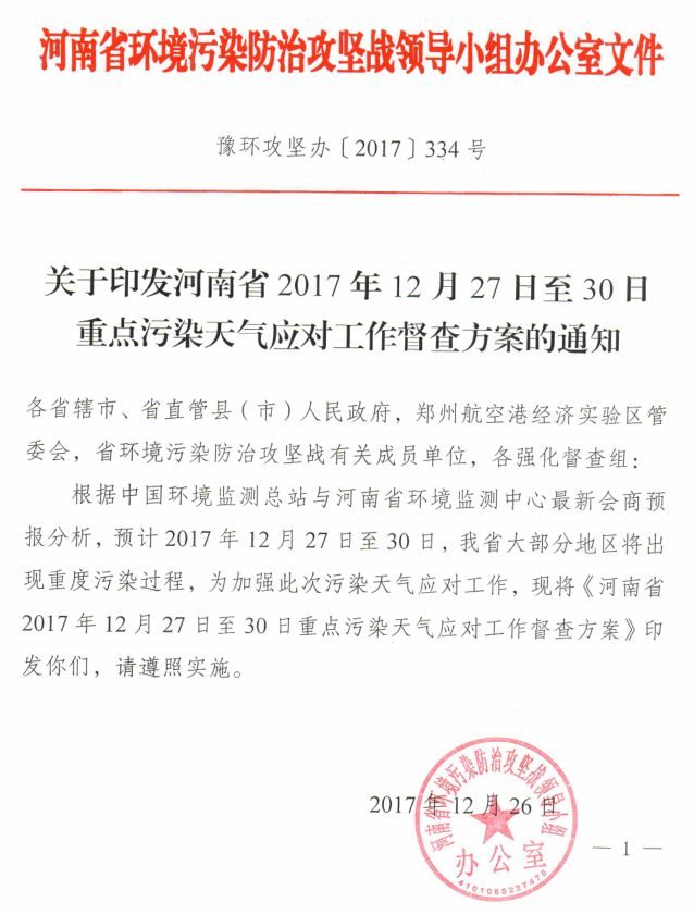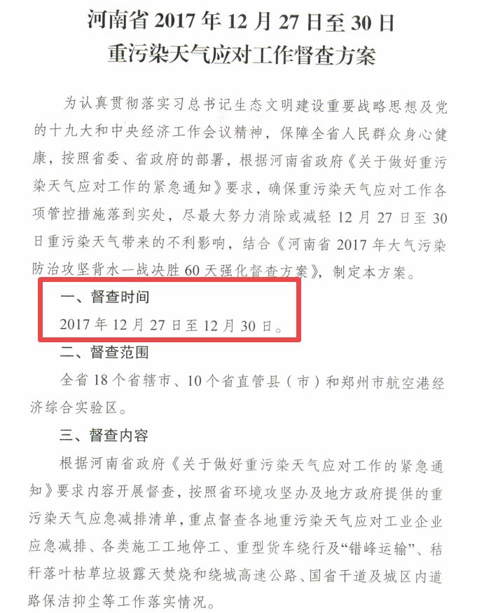 【水泥人網(wǎng)】近日,河南省發(fā)布文件,根據(jù)中國環(huán)境監(jiān)測總站與河南省環(huán)境監(jiān)測中心最新會商預(yù)報分析,預(yù)計2017年12月27日至30日,我省大部分地區(qū)將出現(xiàn)重污染過程,為加強此次污染天氣應(yīng)對工作,將對全省18個省轄市、10個省直管縣(市)和鄭州市航空港經(jīng)濟綜合試驗區(qū)進行為期三天的督查,督查的主要內(nèi)容是檢查涉大氣污染排放工業(yè)企業(yè)停產(chǎn)限產(chǎn)情況,對錯峰生產(chǎn)和重污染天氣應(yīng)急減排清單中的停產(chǎn)企業(yè)是否停到位,對限產(chǎn)企業(yè)的具體限產(chǎn)措施是否落實,對各類工地施工、重型貨車繞行及錯峰運輸?shù)?。具體督查文件如下: