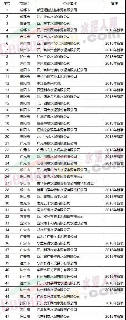 2018年四川省擬納入電力直接交易用戶水泥企業(yè)名單