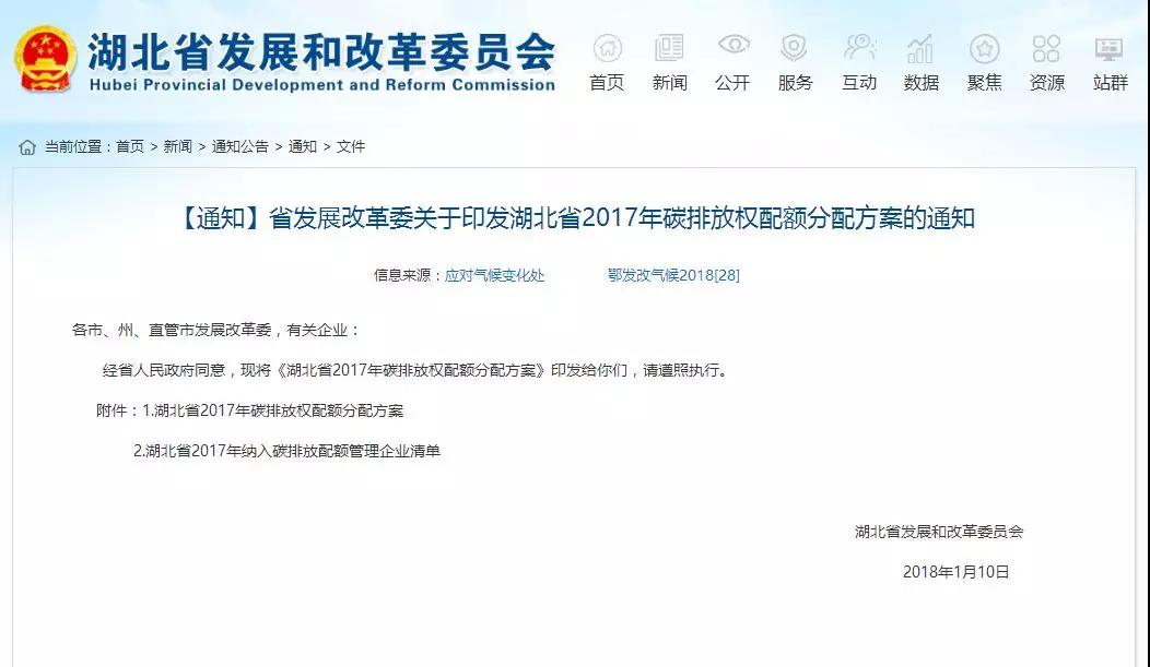 湖北省2017年碳排放權(quán)配額分配方案