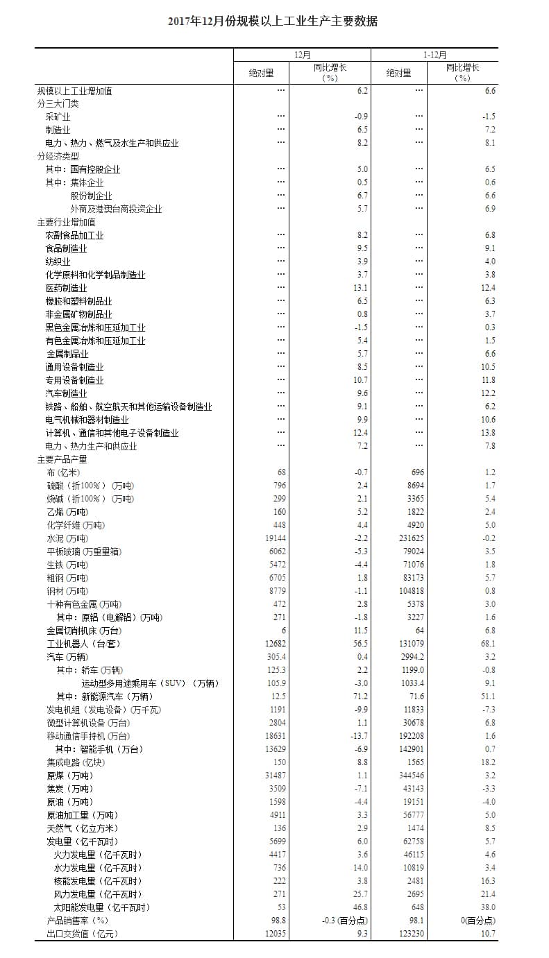 分產(chǎn)品看,12月份,596種產(chǎn)品中有331種產(chǎn)品同比增長。其中,鋼材8779萬噸,同比下降1.1%;水泥19144萬噸,下降2.2%;十種有色金屬472萬噸,增長2.8%;乙烯160萬噸,增長5.2%;汽車305.4萬輛,增長0.4%;轎車125.3萬輛,增長2.2%;發(fā)電量5699億千瓦時(shí),增長6.0%;原油加工量4911萬噸,增長3.3%。