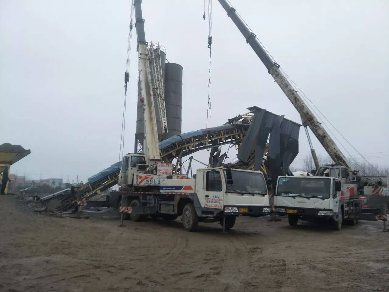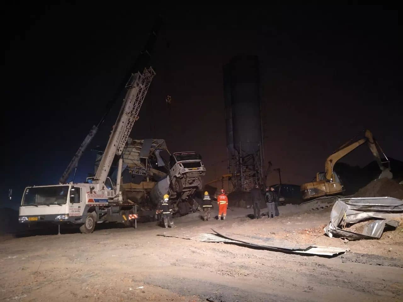 隨后,救援人員立即找來兩臺大型吊機,利用吊機嘗試著把坍塌的水泥罐和散落的鋼板慢慢吊起,在現(xiàn)場人員的指揮下,吊機開始作業(yè)——利用鋼絲繩固定好位置后,慢慢地將罐體向上拉,在兩輛大型的吊機牽拉下,水泥罐體緩緩地離開了地面。