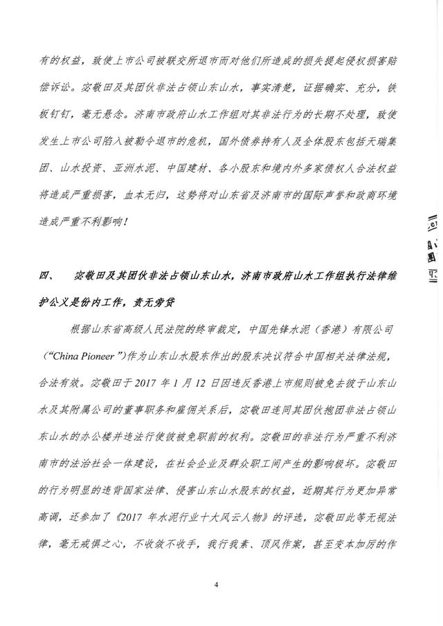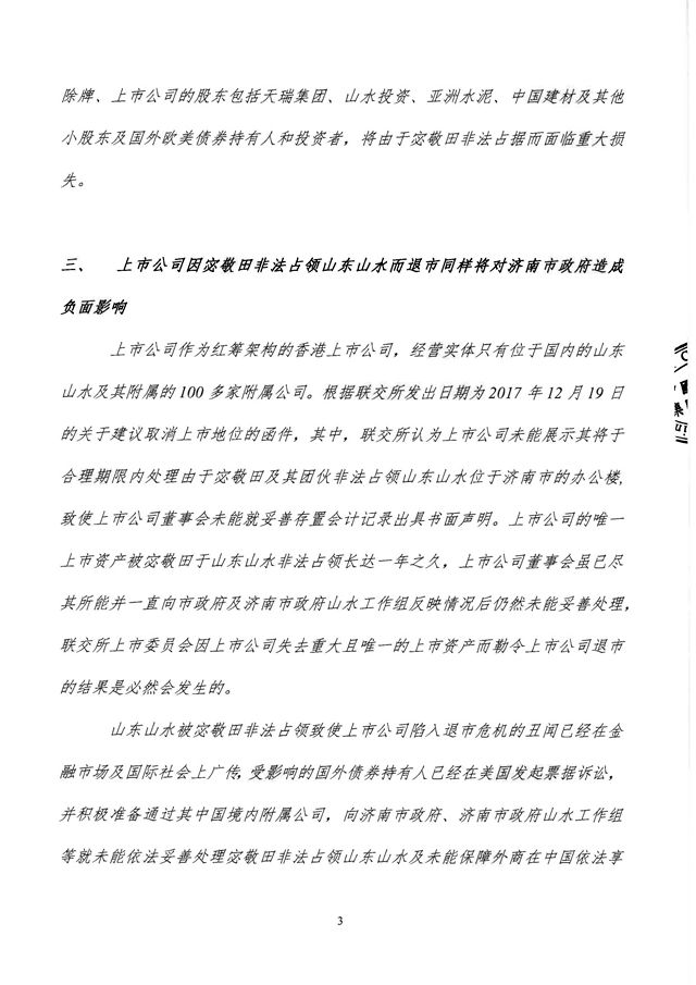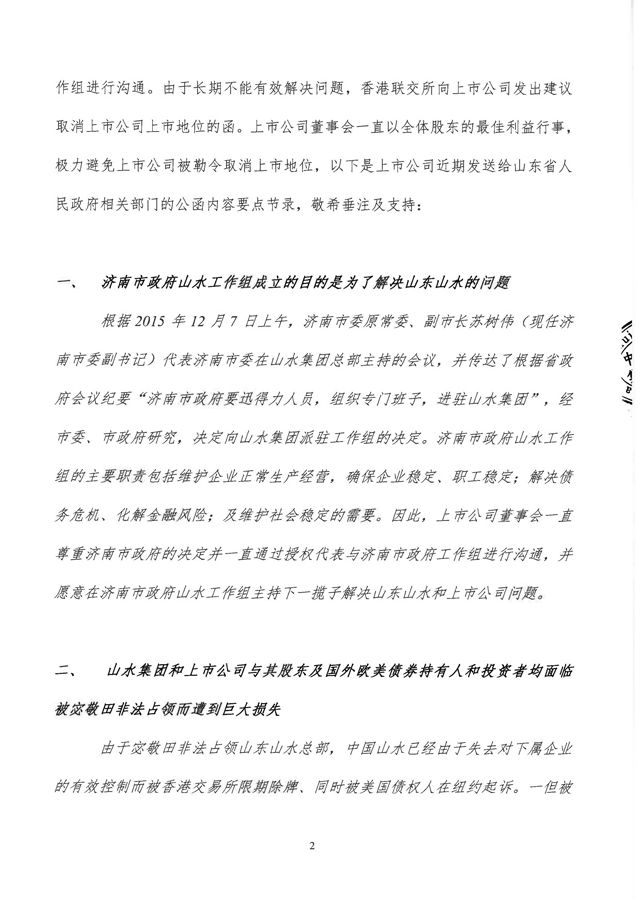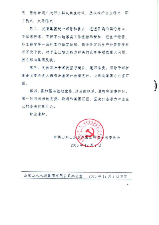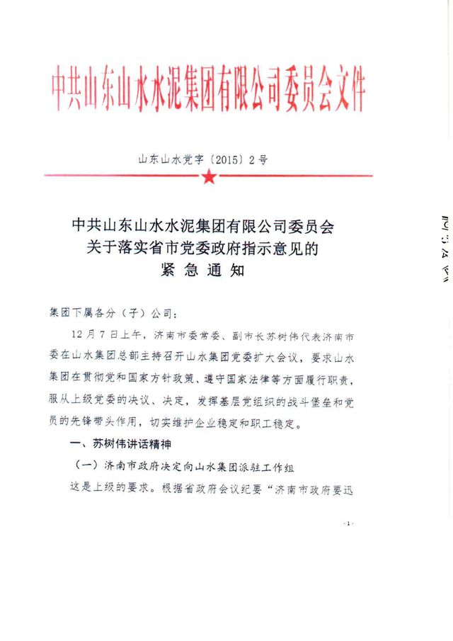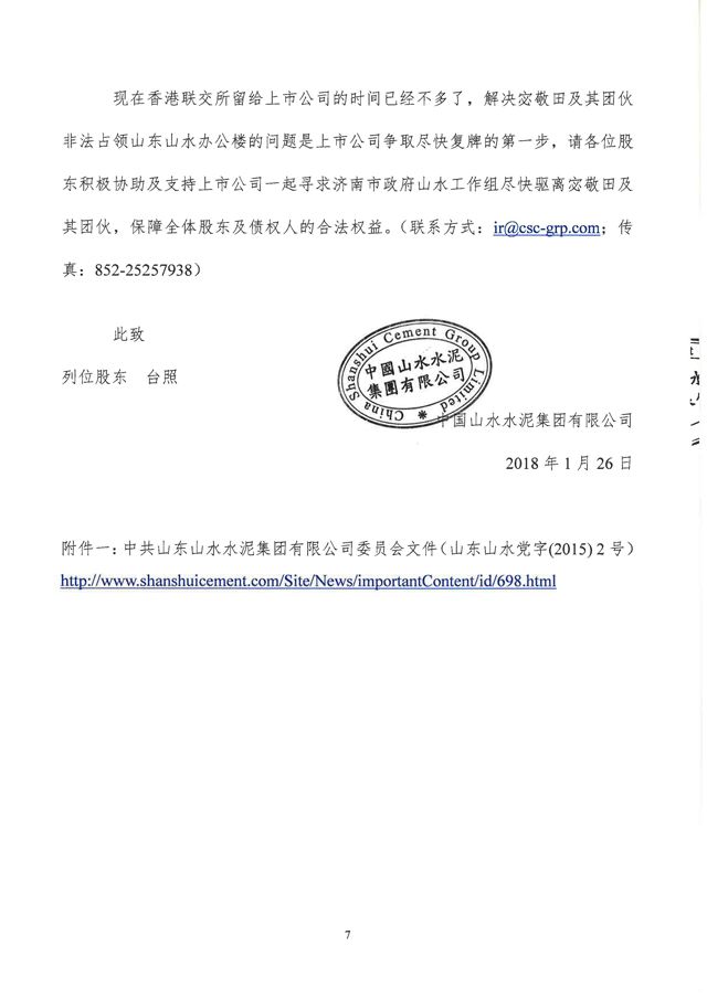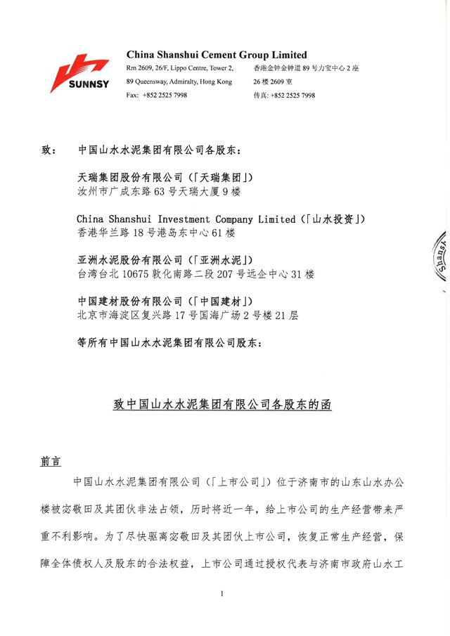 【水泥人網(wǎng)】山水水泥公布,鑒于該公司面臨被建議取消上市地位的迫切風(fēng)險(xiǎn),該公司與山東山水水泥集團(tuán)有限公司董事會(huì)溝通后現(xiàn)向公司全體股東發(fā)出信函。