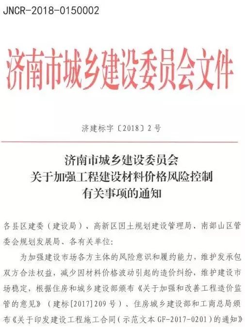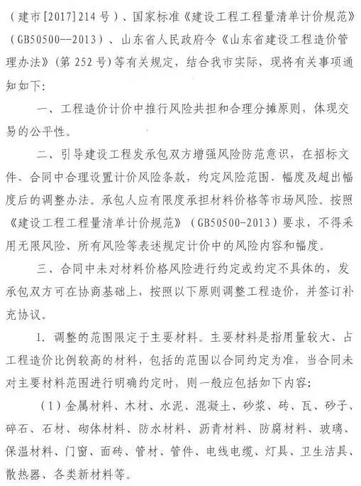 2018年1月30日,濟南市住建委印發(fā)《關(guān)于加強工程建設(shè)材料價格風險控制有關(guān)事項的通知》(濟建標字〔2018〕2號),明確工程計價中應(yīng)推行風險共擔和合理分攤原則,承包人應(yīng)有限度承擔材料價格等市場風險。