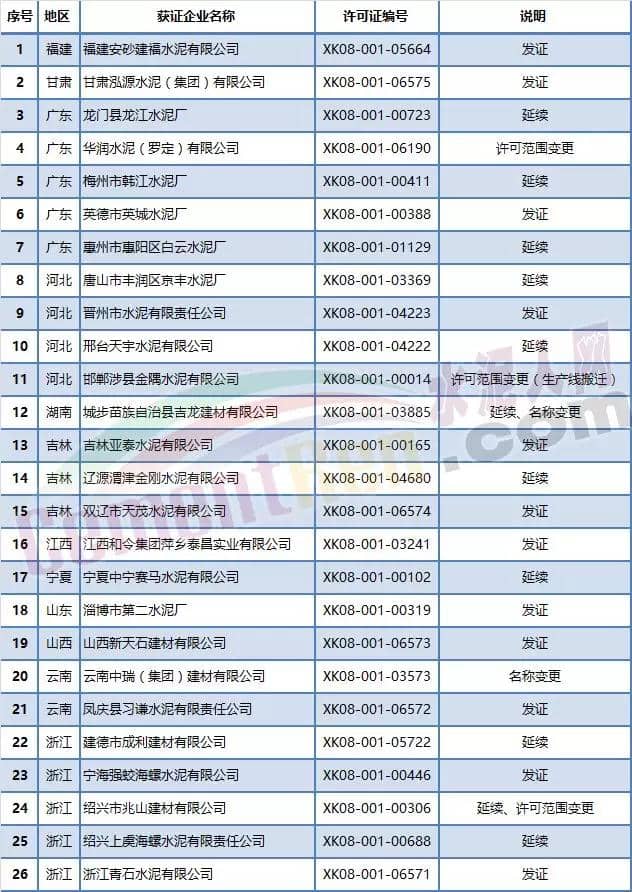 【水泥人網(wǎng)】國家質(zhì)檢總局于本月13日發(fā)放第二批26家水泥企業(yè)生產(chǎn)許可證,涉及河北、吉林 、廣東、山東、山西、福建、浙江、湖南、云南、江西、甘肅、寧夏等12個省自治區(qū)。其中新發(fā)證書12家企業(yè),涉及項目變更的5家企業(yè),到期延續(xù)的9家企業(yè)。詳細(xì)名單如下: