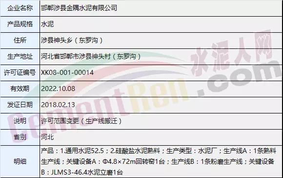 一、邯鄲涉縣金隅水泥有限公司本次申領(lǐng)生產(chǎn)許可證項目為許可范圍變更(生產(chǎn)線搬遷)