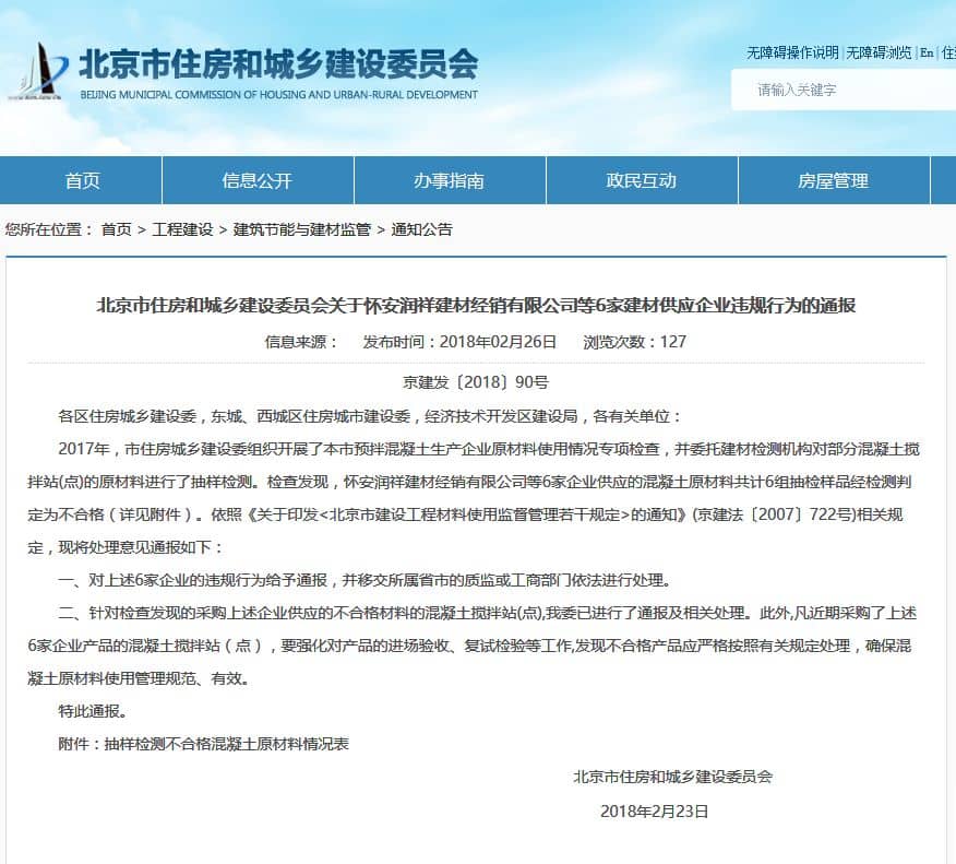 【水泥人網(wǎng)】日前,北京市住房和城鄉(xiāng)建設(shè)委員會通報了6家建材供應(yīng)企業(yè)的違規(guī)行為。通報文件稱2017年,市住房城鄉(xiāng)建設(shè)委組織開展了本市預(yù)拌混凝土生產(chǎn)企業(yè)原材料使用情況專項檢查,并委托建材檢測機構(gòu)對部分混凝土攪拌站(點)的原材料進行了抽樣檢測。