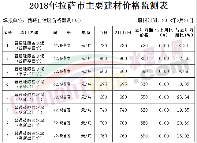 【水泥人網(wǎng)】2018年開年,水泥最高價的地方還是西藏地區(qū)。據(jù)監(jiān)測數(shù)據(jù)顯示,西藏拉薩市建材市場水泥價格與前期持平。