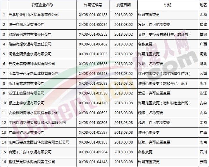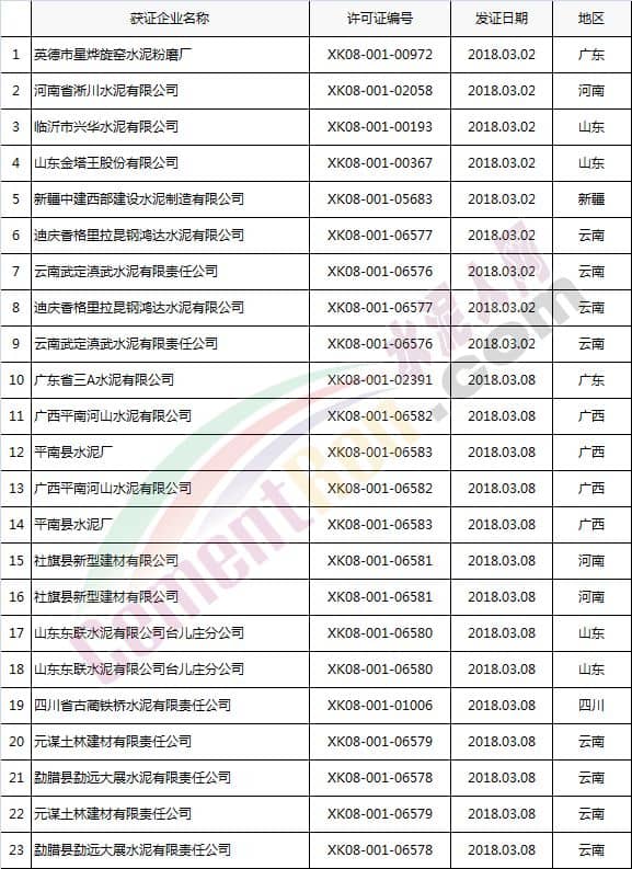 【水泥人網(wǎng)】國家質(zhì)檢總局于本月2日、8日分別放發(fā)本月第1批和批2批水泥企業(yè)生產(chǎn)許可證。其中涉及新發(fā)證書的23家,涉及到期延續(xù)的16家企業(yè),涉及變更的16家企業(yè)。