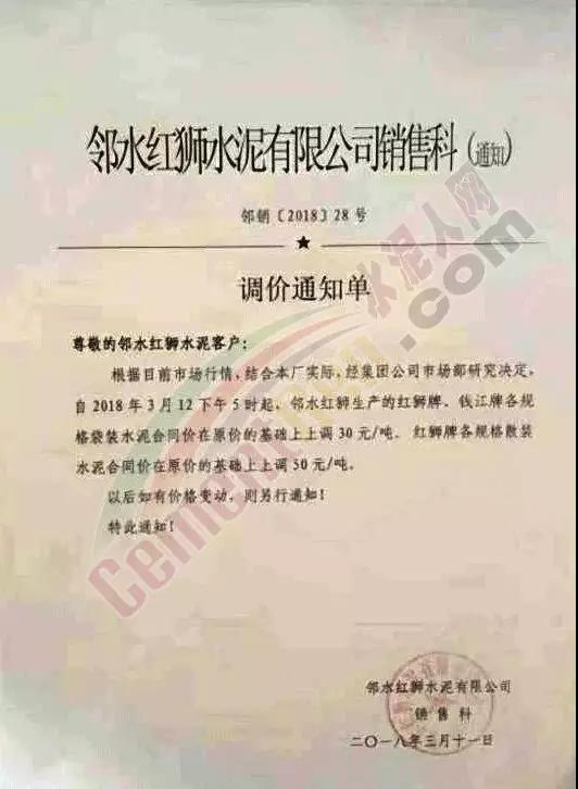 川東區(qū)域主導企業(yè)鄰水紅獅水泥調(diào)價通知稱:根據(jù)目前市場行情,結合本廠實際,經(jīng)集團公司市場部研究決定,自3月12日下午5時起,上調(diào)紅獅牌、錢江牌各規(guī)格袋裝水泥合同價在原價的基礎上上調(diào)30元/噸,紅獅牌各規(guī)格散裝水泥合同價在原價基礎上上調(diào)50元/噸。通知文原文如下