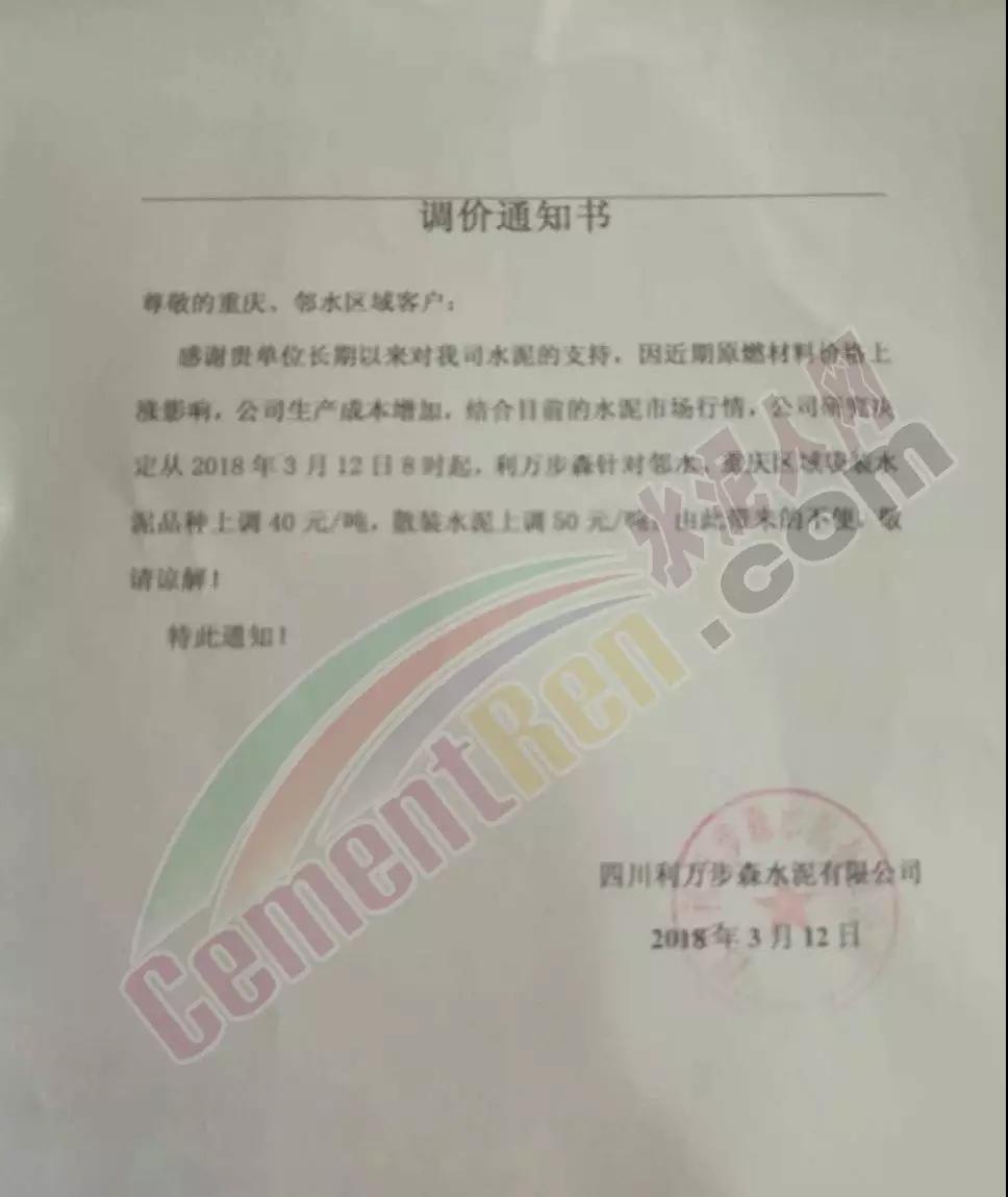 另據(jù)水泥人網(wǎng)重慶通訊員消息,自昨日(12日)起,重慶主城區(qū)企業(yè)陸續(xù)發(fā)布通知上調(diào)水泥出廠價,上調(diào)幅度也在30-50元/噸。