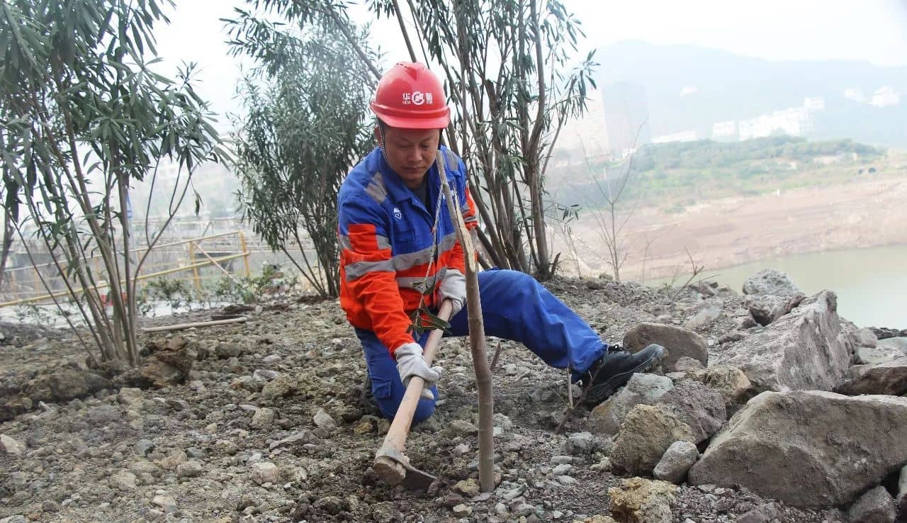 桑植公司員工正在石灰石堆場邊挖樹坑