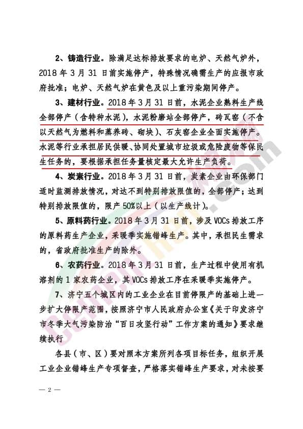 2018 年 3 月 31 日前,水泥企業(yè)熟料生產(chǎn)線全部停產(chǎn)(含特種水泥),水泥粉磨站全部停產(chǎn),磚瓦窯(不含 以天然氣為燃料和蒸養(yǎng)磚、砌塊)、石灰窯企業(yè)全面實施停產(chǎn)。