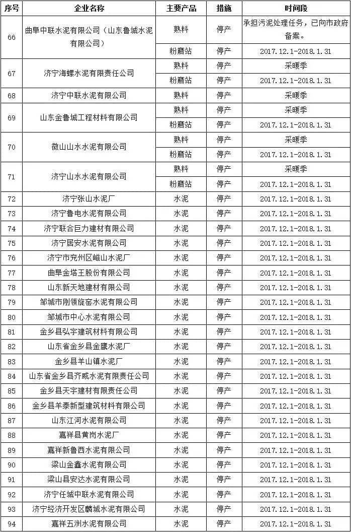 濟寧水泥企業(yè)錯峰生產(chǎn)名單