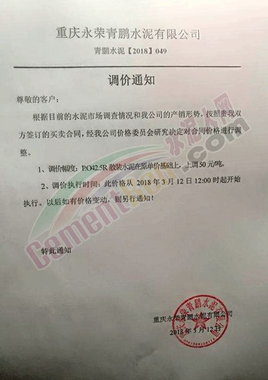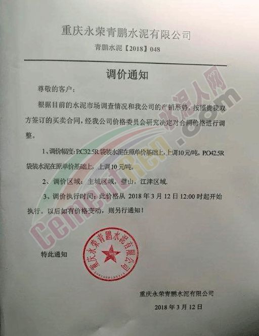 以上兩份調(diào)價(jià)通知,一份通知是PO42.5R散裝在原單價(jià)基礎(chǔ)上上調(diào)50元/噸, 另是一份是針對(duì)于重慶主城區(qū)、璧山,江津區(qū)域PC32.5R袋裝水泥在原單價(jià)基礎(chǔ)上上調(diào)10元/噸,PO42.5R袋裝水泥在原基礎(chǔ)上上調(diào)10元/噸。