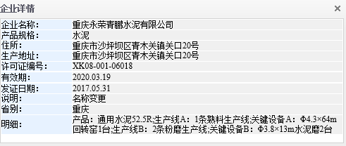 質(zhì)檢總局信息中心數(shù)據(jù)顯示,重慶永榮青鵬水泥有限公司位于重慶市沙坪壩區(qū)青木關(guān)鎮(zhèn)關(guān)口20號(hào) 。