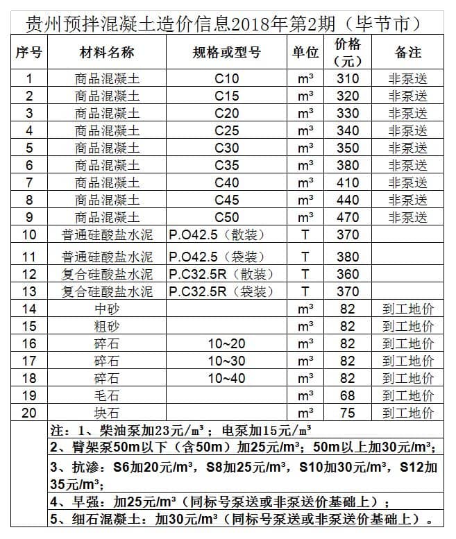 造價 | 貴州省預拌混凝土造價信息2018年第2期